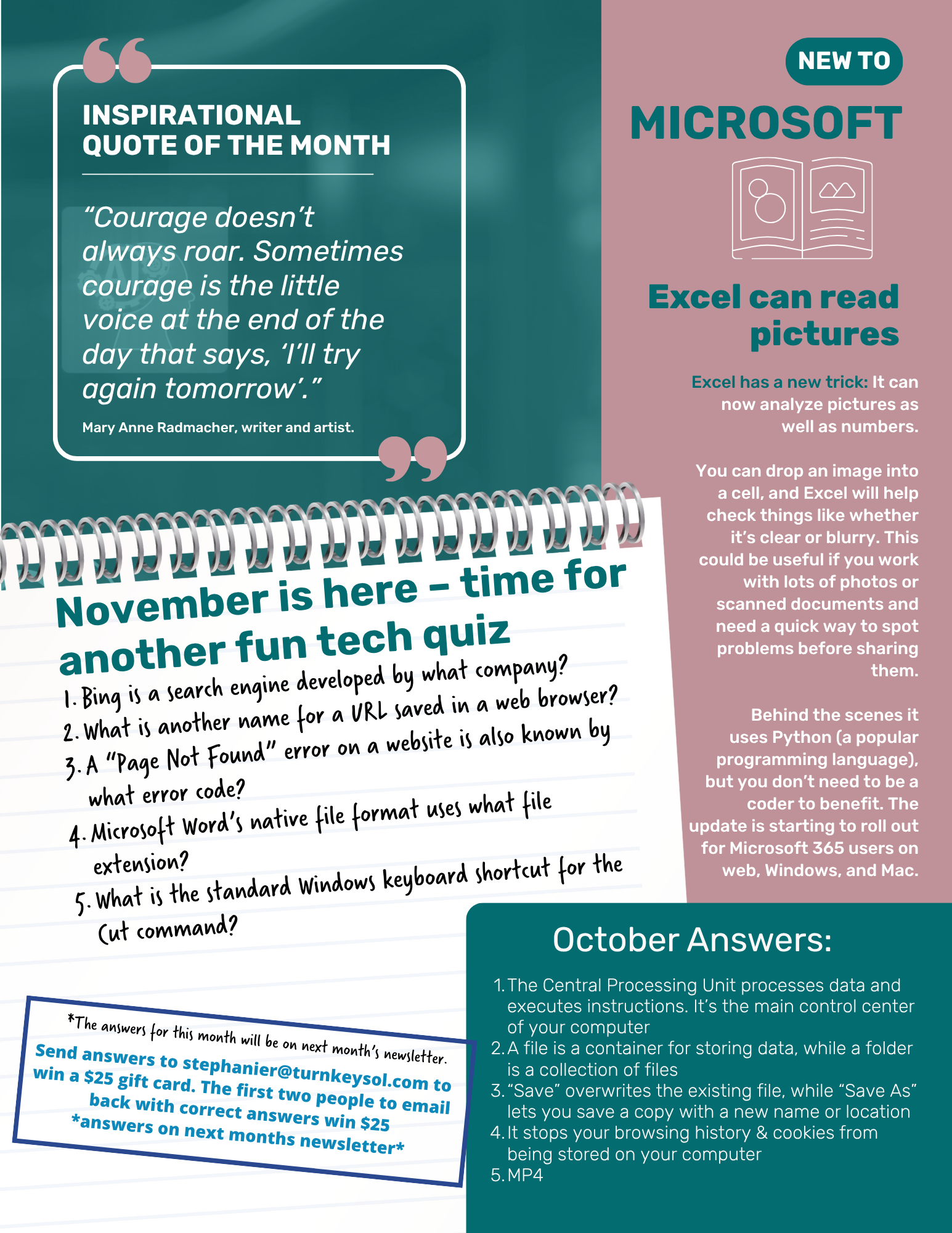 - Tech Quiz (remember to submit your answers to win: email: stephanier@turnkeysol.com)