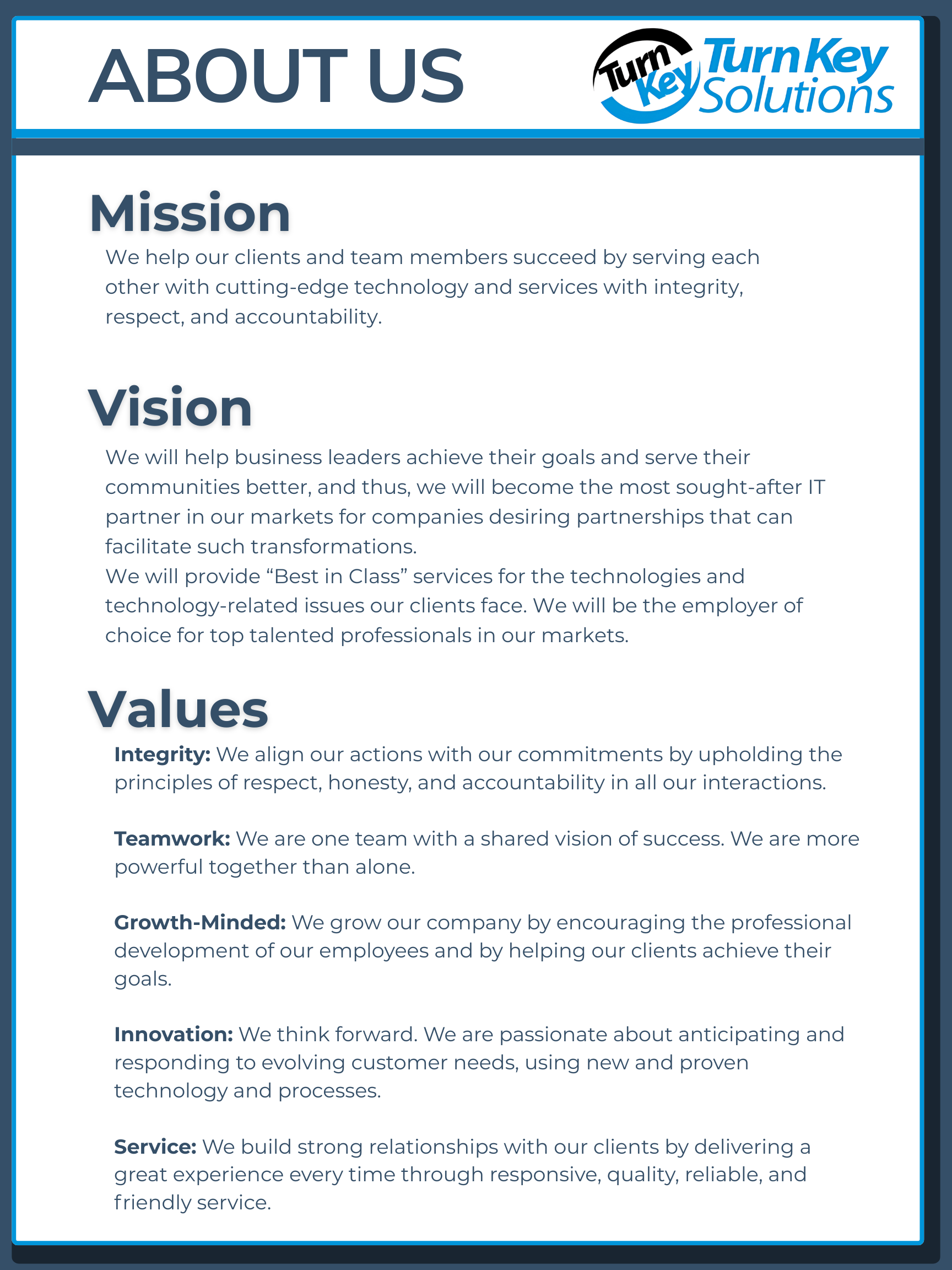 At Turn Key Solutions, our vision is to help business leaders achieve their goals and serve their communities better. We strive to be the most sought-after IT partner in our markets, delivering best-in-class services and cultivating a workplace where top talent thrives.